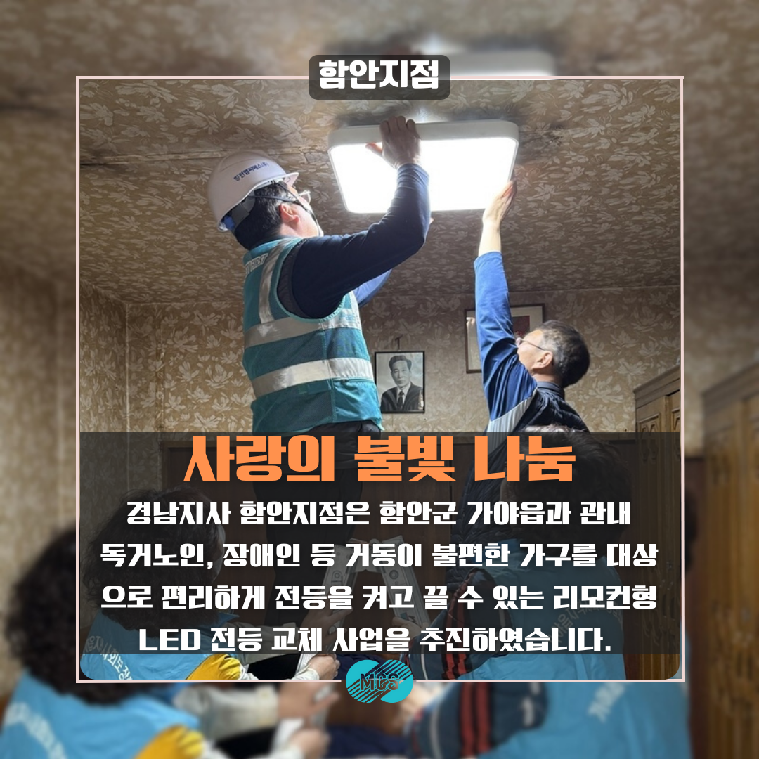 경남지사 함안지점은 함안군 가야읍과 함께 관내 독거노인, 장애인 등 거동이 불편한 가구를 대상으로 LED 전동 교체 사업을 시행하였습니다. "사랑의 불빛 나눔 사업"은 지역사회보장협의체와 함께 거동이 불편한 어르신이 자리에 누워서도 불을 켜고 끌 수 있게 리모컨형 LED전등을 달아주는 사업입니다.