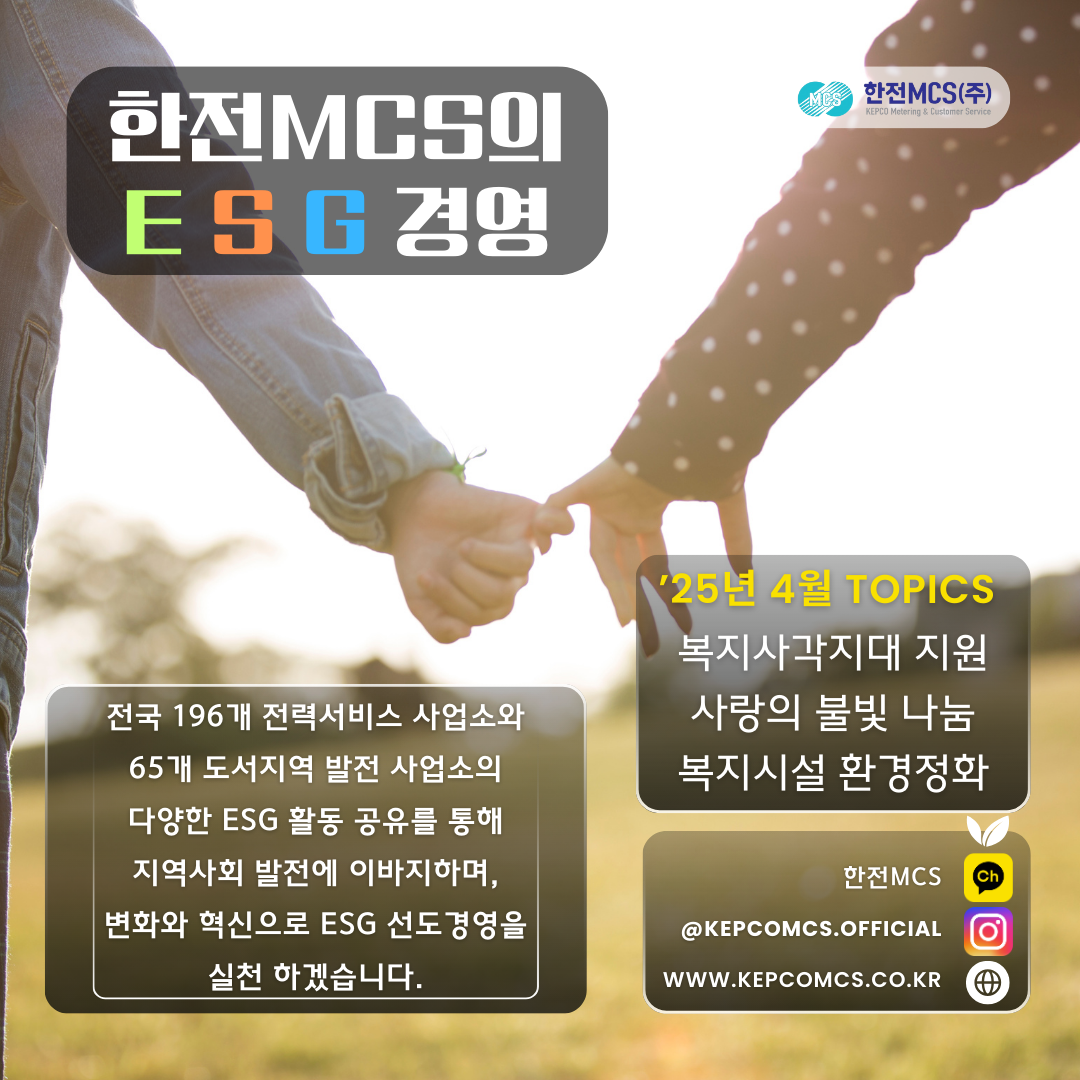 한전MCS 토픽은 매달 발행되며 전력사업소 및 도서발전사업소의 ESG 활동 중 3개 사업소를 선정하여 인스타그램, 카카오채널, 블로그에 공유하고 있습니다.