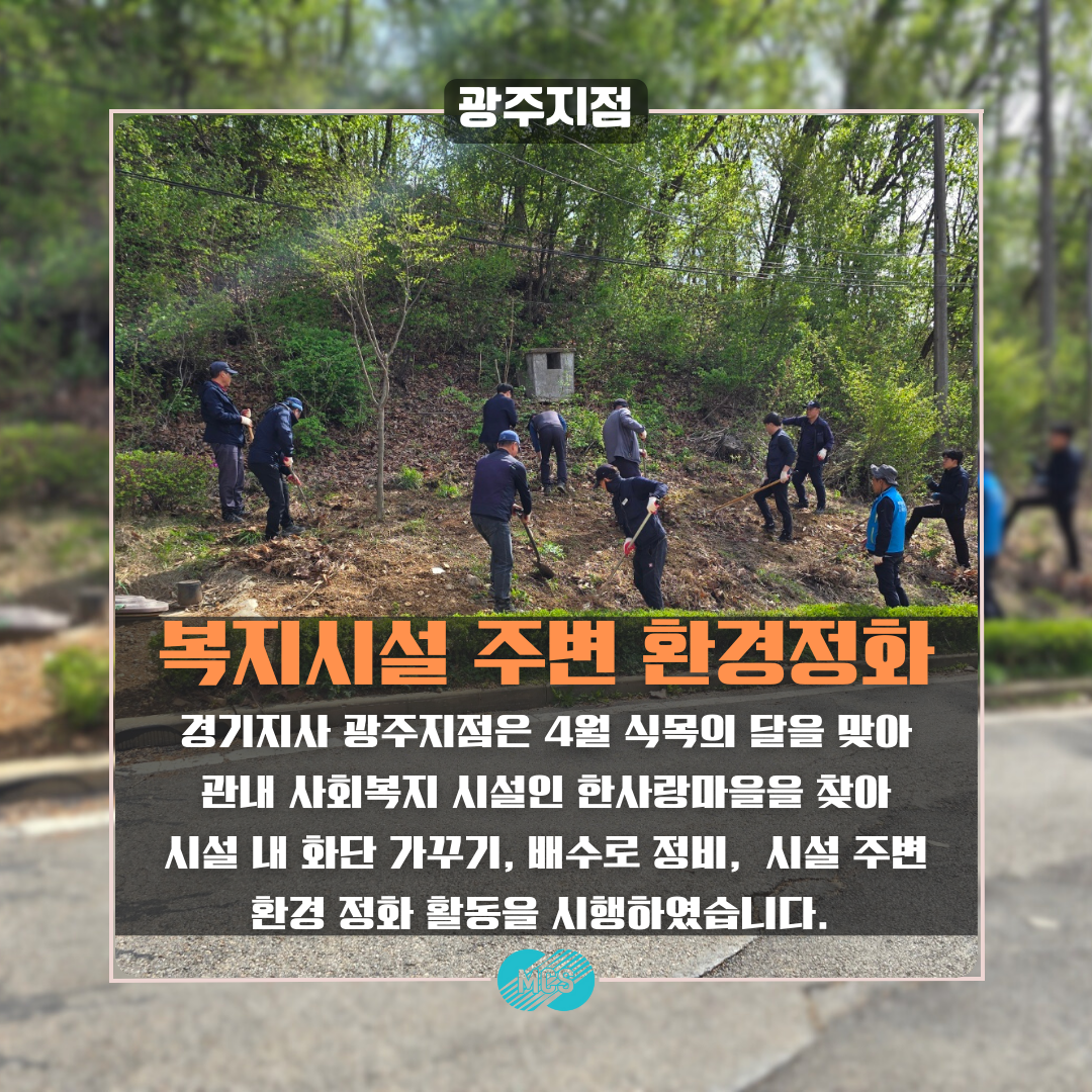 경기지사 광주지점은 4월 "식목의 달"을 맞아 광주시 관내 사회복지 시설인 한사랑마을을 찾아 시설내 화단 정리, 배수로 정비 등 환경정화활동을 시행하였습니다. 광주지점 전 직원은 지속적인 봉사활동에 참여하여 지역사회 발전에 이바지하였습니다.