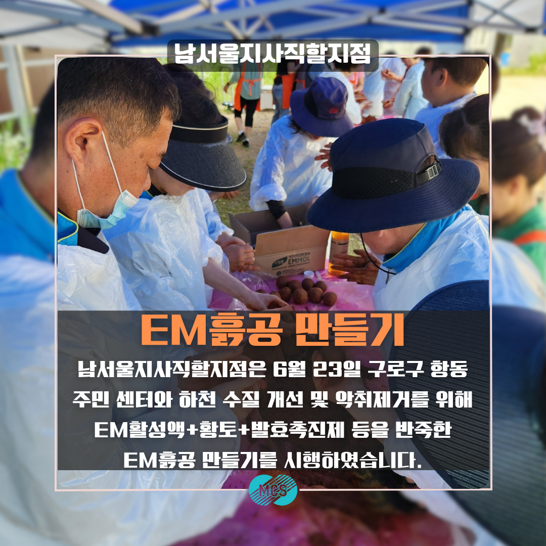 남서울지사직지점은 6월 23일 서울 구로구에 위치한 항동 주민센터와 연계하여 하천 수질 개선을 위해 EM흙공 만들기를 시행하였습니다. EM흙공은 Effective Microorganism으로 미생물 발효액와 황토를 혼합해 만든 친환경 정화제로 물속에 들어가면 서서히 녹으면서 수질 개선과 악취 제거에 효과를 발휘하는 것으로 하천 생태계 복원을 통해 대기 중 이산화탄소 저감에 긍정적인 영향을 줄 수 있습니다.