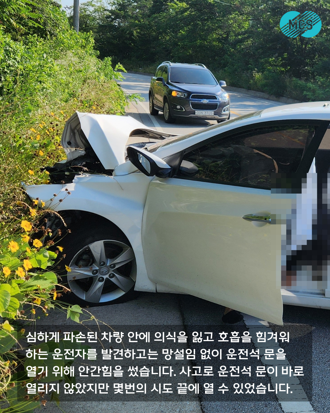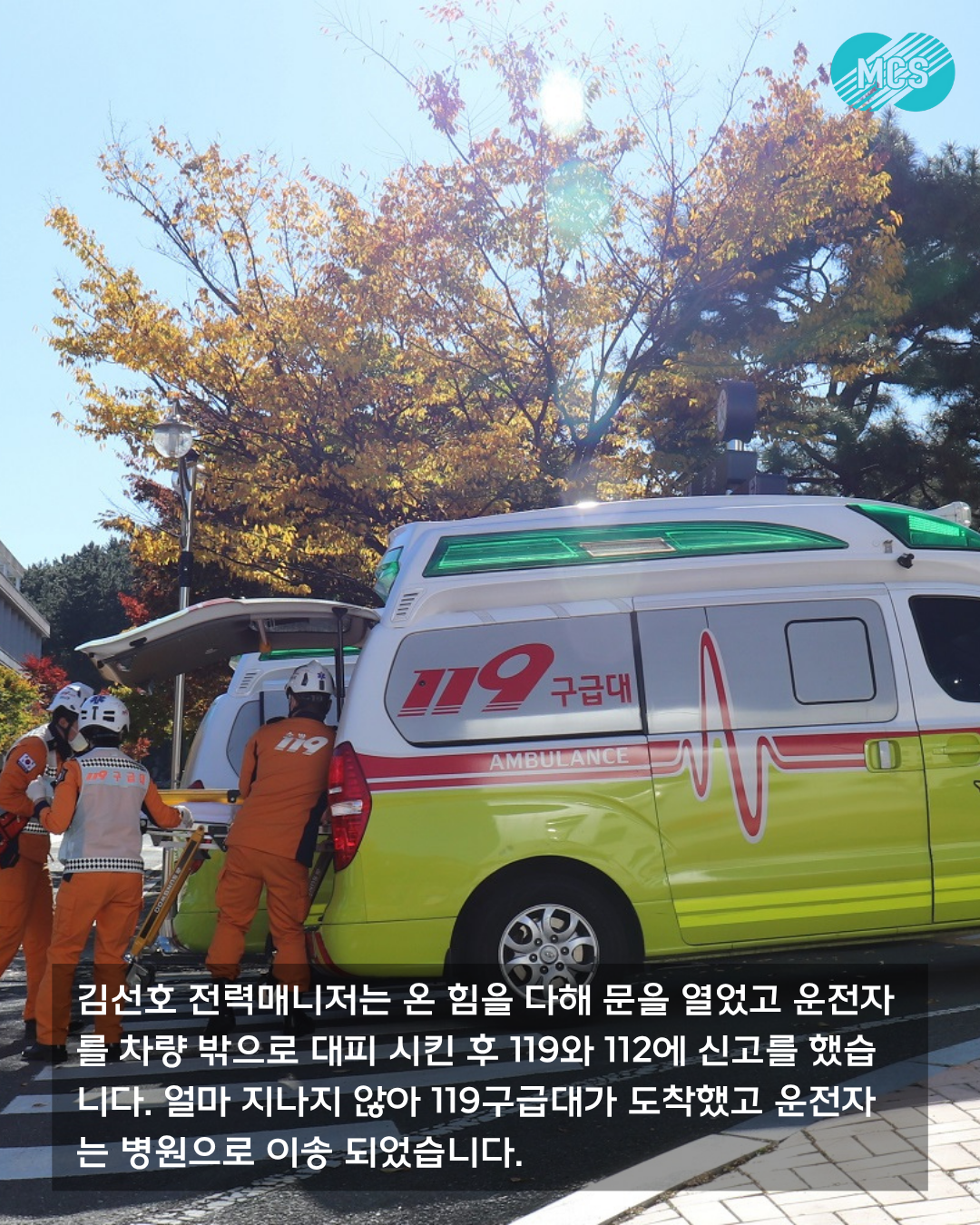 한전MCS 남원지점의 김선호 전력매니저는 지난 9일 8시 20분경 전북 남원시 일원의 한 도로에서 출근길 교통사고를 목격하고는 바로 현장으로 뛰어갔다. 최고 발견자로서 생각할 겨를도 없이 몸이 먼저 반응했다. 차량 안 운전자를 확인하기 위해 문밖에서 차량 창문 안을 살피던 중 터진 에어백 뒤로 쓰러진 운전자를 발견했다.