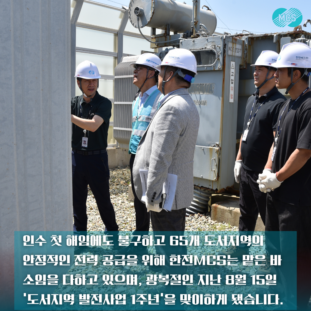 한전MCS는 작년 8월 15일 한국전력에서 관리중인 65개 도서지역의 발전 시설 운영에 대한 사업 인수를 통해 '도서지역 발전설비 운영 및 기술 지원'을 시작했습니다.