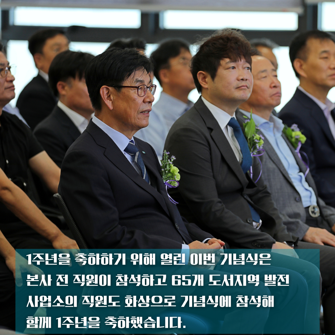 기념식은 본사 전 직원이 참석하고 65개 도서의 발전사업소 직원들은 화상으로 기념식을 함께하며 1주년을 축하했습니다.