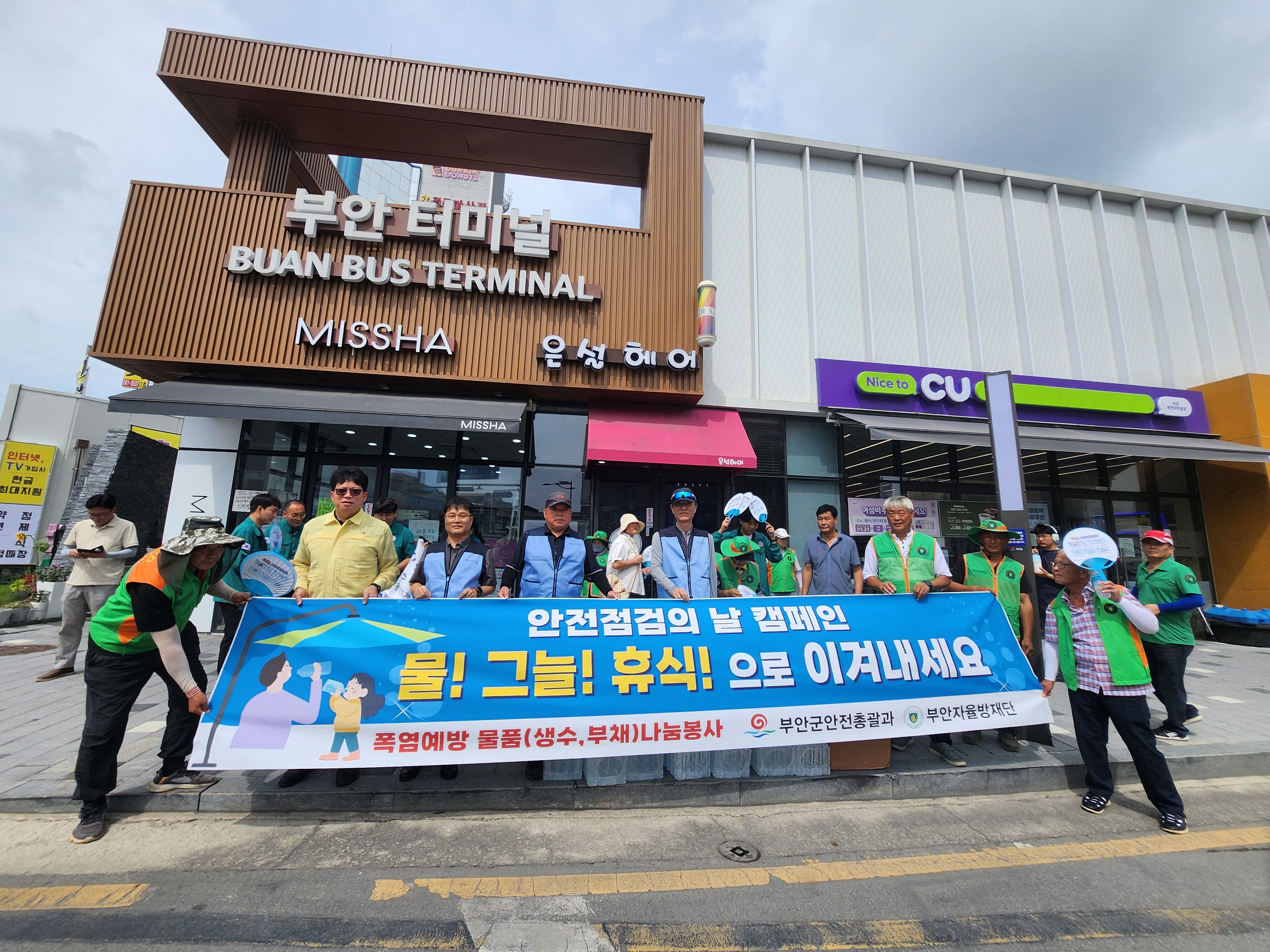 한전MCS 부안지점(지점장 양기철)은 지난 8월 8일 부안읍 터미널사거리에서 폭염과 폭우에 대한 군민 안전의식을 높이기 위한 '안전검검의 날 캠페인'을 부안군청 및 자율방재단과 함께 시행했습니다. 이번 캠페인은 여름철 일어나는 각종 안전사고에 대비하기 위한 캠페인이며 폭염·폭우, 물놀이 사고, 온열질환 등 군민 생활에 밀접한 사례를 토대로 생수 1,000병과 부채 1,000매를 군민들께 배부했습니다.