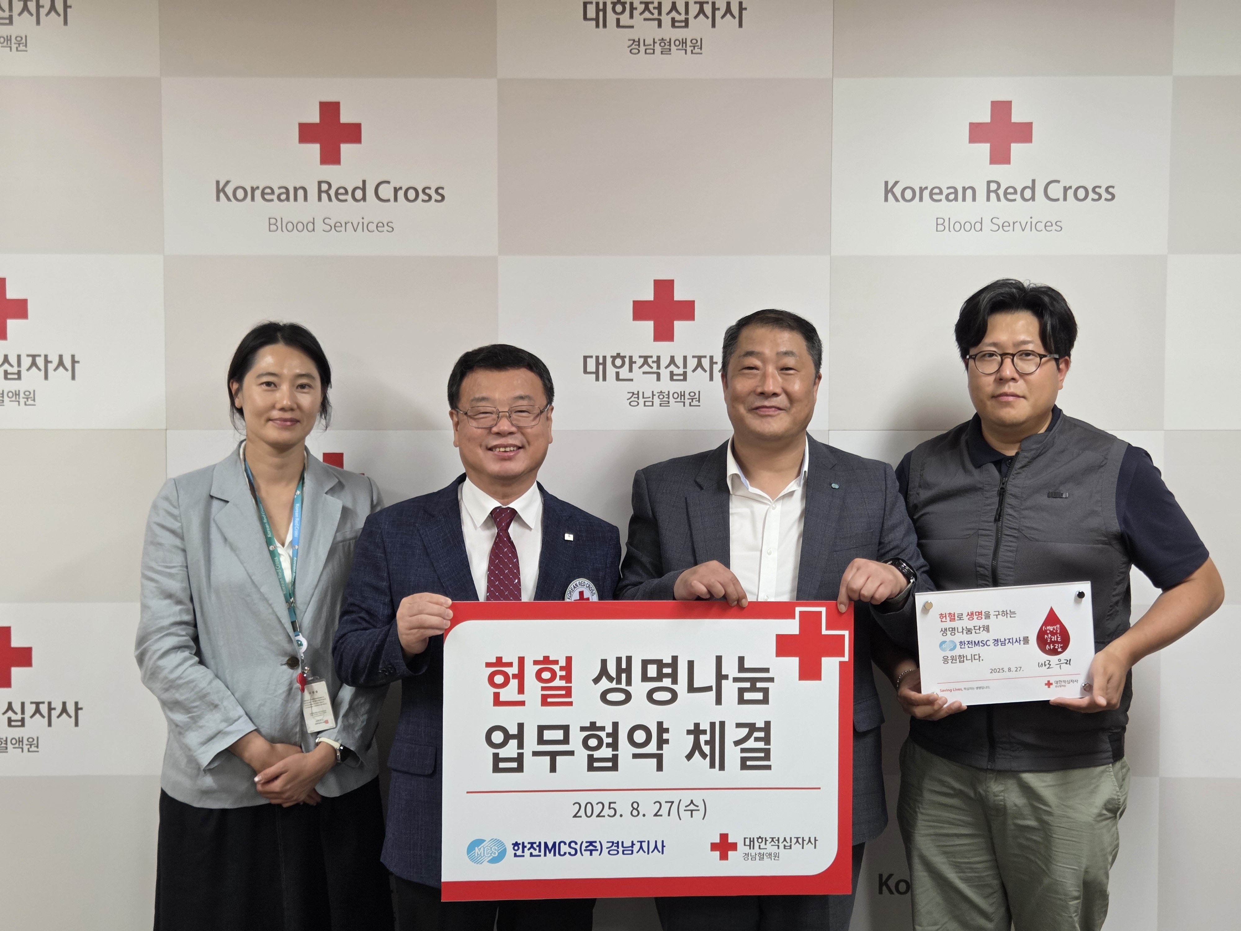 한전MCS 경남지사(지사장 김대중) 및 18개 지점은 지난 8월 27일 대한적십자사 경남혈액원과 '헌혈 생명 나눔 업무협약'을 체결했습니다. 헌혈 문화를 확산하고 혈액 수급 불안정을 해결하기 위한 협력의 일환으로, 양 기관은 혈액이 부족한 시기에 정기적으로 헌혈에 참여하고 헌혈 문화 정착을 위해 협력하기로 했습니다. 한전MCS 경남지사장은 "헌혈이 생명을 지킬 수 있는 숭고한 나눔" 이라며, "헌혈 운동을 지속적으로 전개하겠다"고 밝혔습니다.